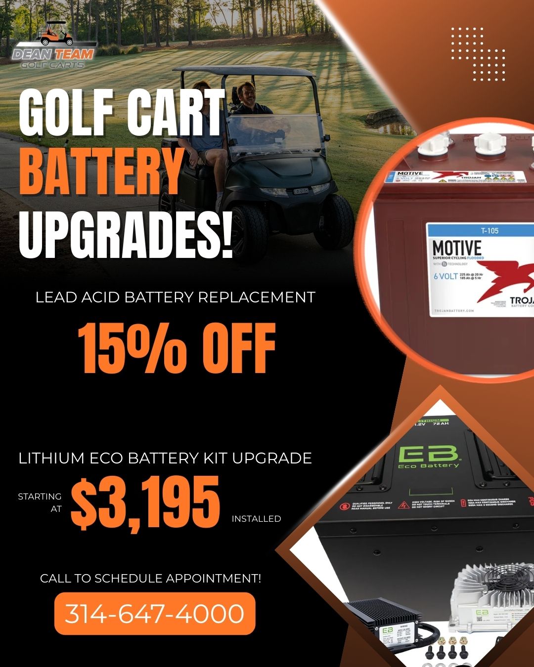 Were your golf cart batteries neglected this winter and now they won't charge? Upgrade your golf cart battery for the spring season with 15% off lead acid battery replacement, or upgrade to lithium eco batteries starting at $3,195 for all major brands like E-Z-GO, Club Car, Icon EV, Yamaha, Cushman, and more.