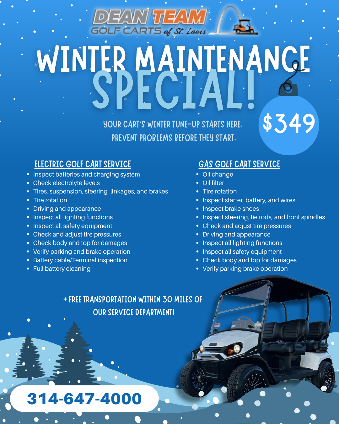 Prevent problems before they start with a winter annual maintenance! We service gas golf carts and electric golf carts from brands like E-Z-GO, Yamaha, Club Car, Icon, etc. starting at $349 with free transportation within 30 miles of our service facility.