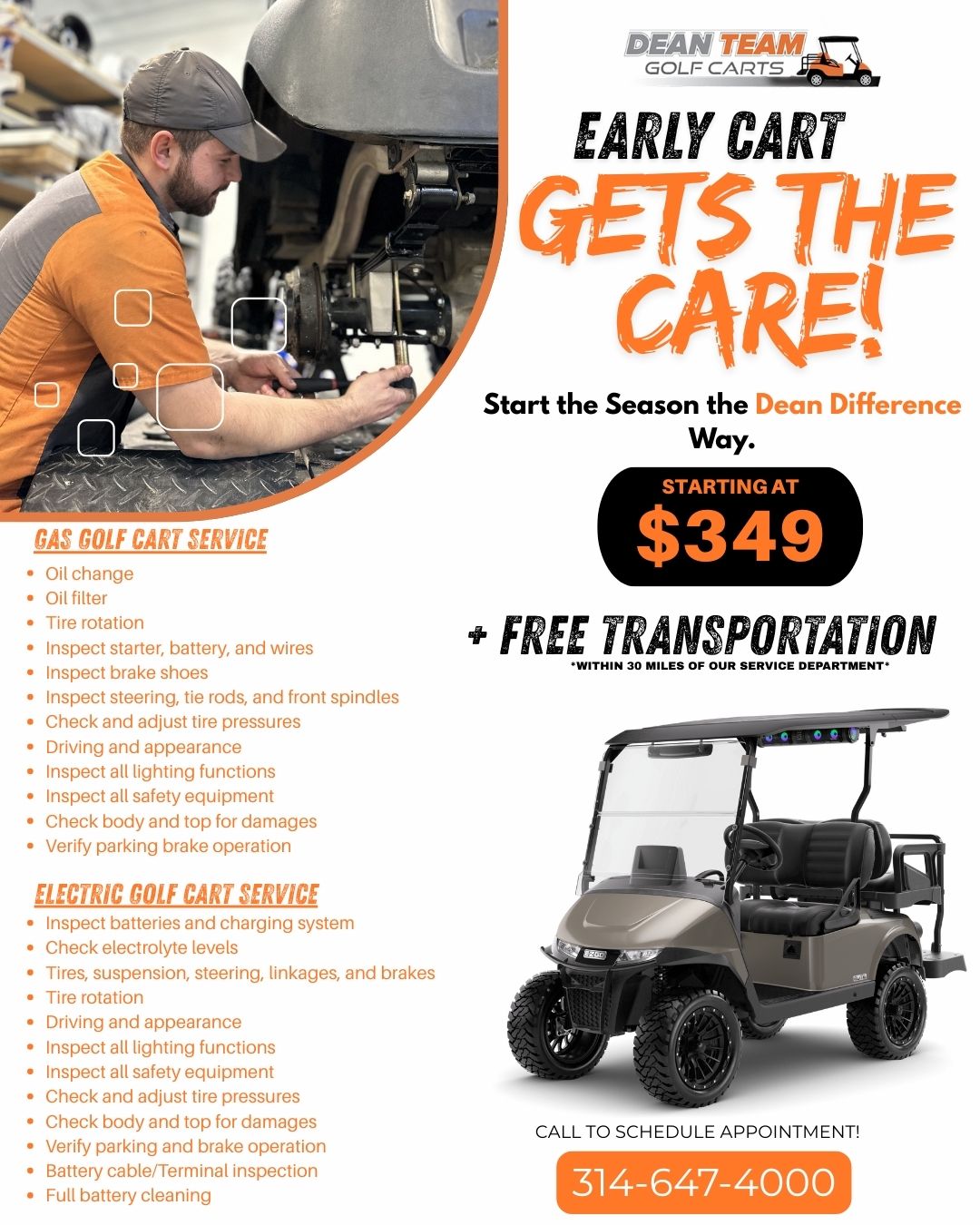 Start the season the Dean Difference Way with annual maintenance service starting at $349. We service gas and electric golf carts for all top brands like E-Z-GO, Club Car, Yamaha, Cushman, Icon EV, EPIC, and more. Plus, get free transportation within 30 miles of our service department..jpg)